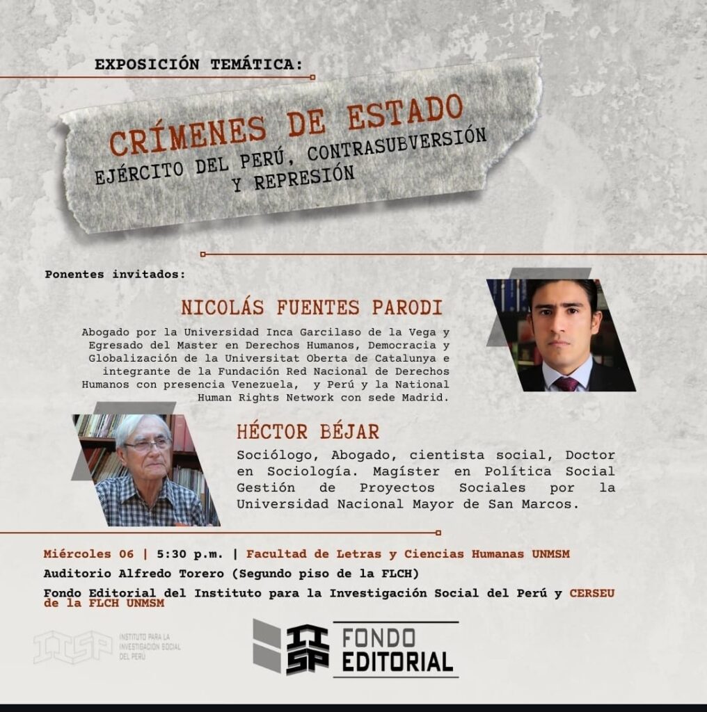 El pasado 12 de diciembre de 2023 se llevo a cabo la exposición Temática: Crímenes de Estado: Ejercito del Perú, Contrasubversiòn y Represión” de la que participó el abogado Nicolas Fuentes Parodi.