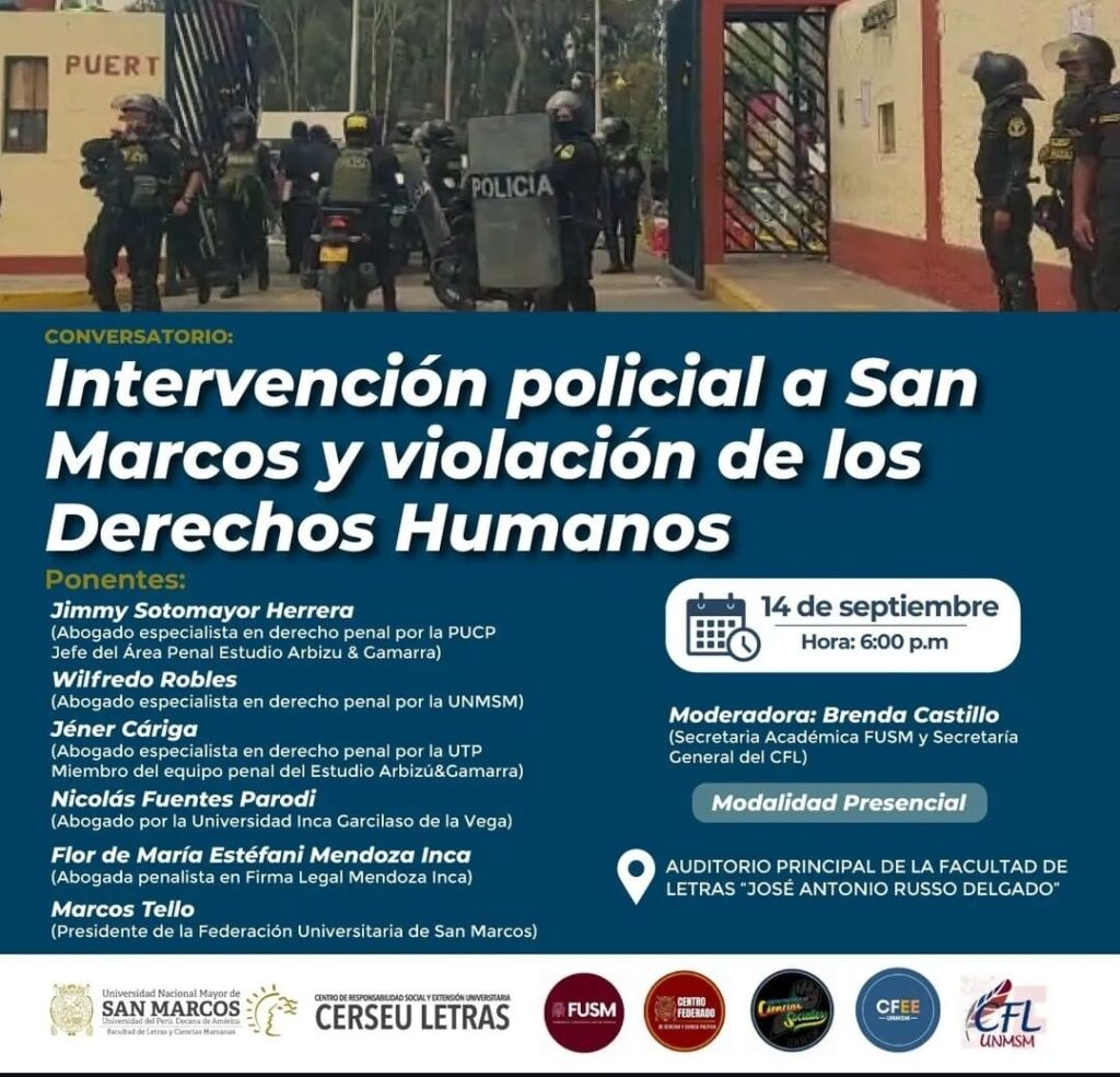 El pasado 14 de septiembre de 2023, se llevó a cabo el conversatorio “Intervención Policial a San Marcos y Violación de los Derechos Humanos” donde participó en el abogado Nicolas Fuentes Parodi, junto otros defensores de los derechos humanos, entre abogados litigantes y dirigentes estudiantiles.